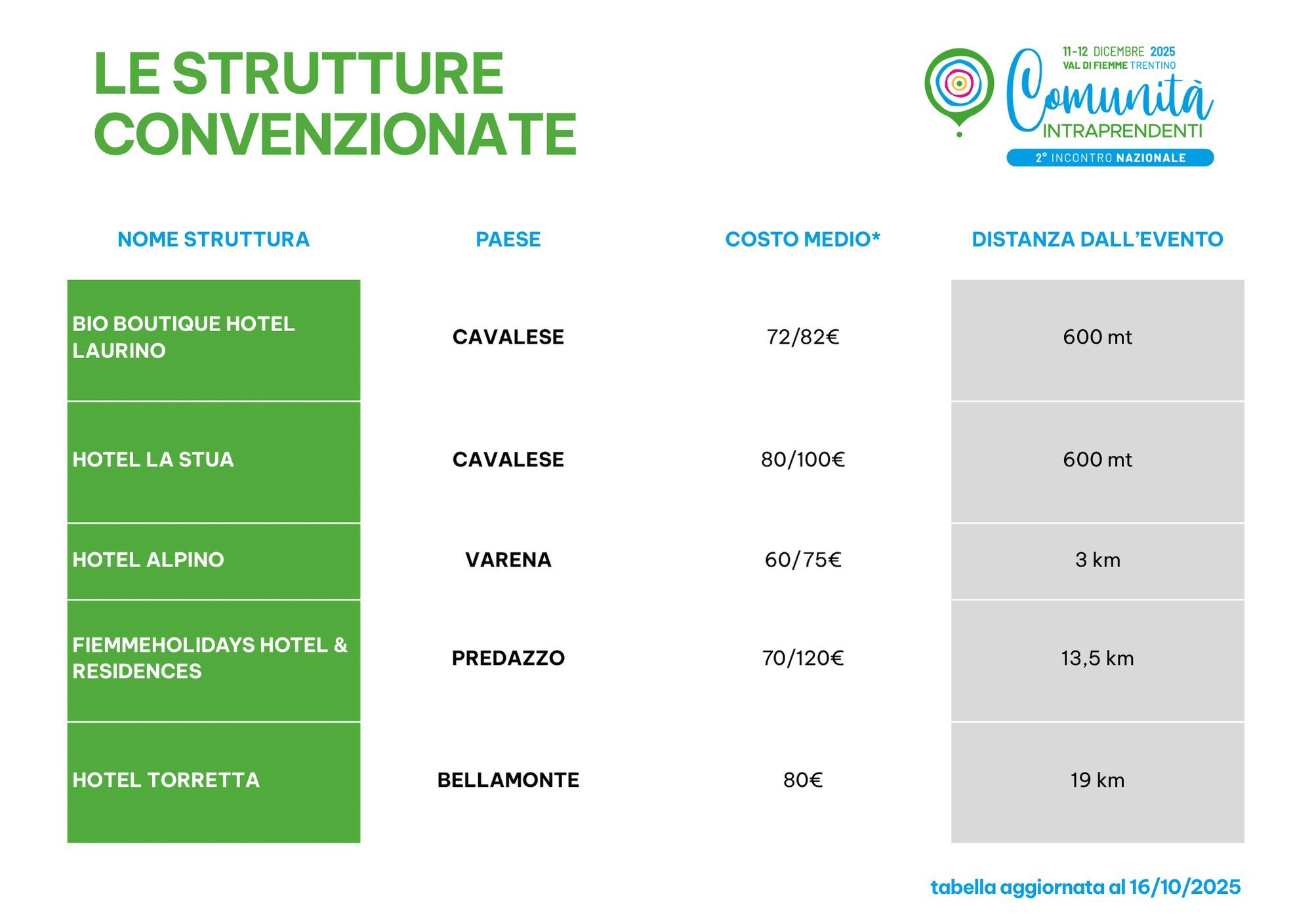 Le strutture convenzionate con l’evento sono: